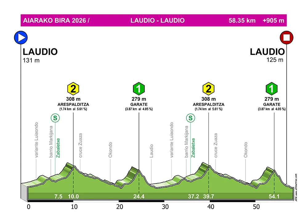 La etapa reina de esta edición es asimismo la más larga (58,3km). Se dan dos vueltas al recorrido que saliendo por Gardea se dirige a Respaldiza (1,7km al 5,6%) con pendientes del 12%. Superando Okondo nos dirigimos al Pto. Garate (4km al 4%) con su final explosivo. Entrando por Ugarte llegamos a Zumalakarregi, final de Aiarako Bira 2026.